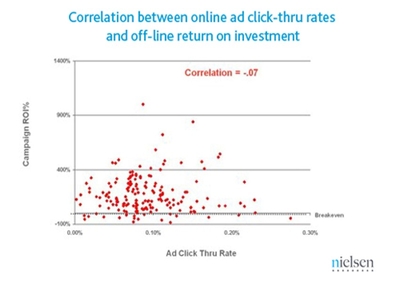 Clicks aren’t a good proxy for brand results. There is no significant correlation between click-thru rate (CTR) and any Nielsen brand effect metrics, such as ad recall, brand awareness or purchase intent.