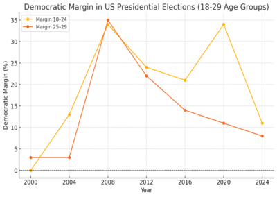It’s not new to say generations are misleading, but voting behaviour makes it clear to see: in the 2024 US election, Kamala Harris’s winning margin declined by 23 points among 18-24 year olds but only 3 points among 25-29 year olds. Technically, these age groups are both part of Gen Z.
