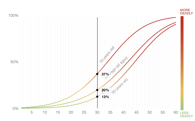The danger of car collisions isn’t linear. You’re very unlikely to die when going at less than 20 miles per hour. But at 30 miles per hour, about one in five pedestrians will not survive. And at 40 miles per hour, half will not survive.