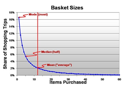 In fact they’re very rare. Panel data shows that the most common number of items purchased in a supermarket is one, with half of all trips buying 5 or fewer items.