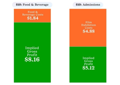 For every $10 that moviegoers spend on hot dogs, nachos, popcorn, and soda, AMC company takes a whopping $8.16. By comparison, for every $10 that AMC takes on ticket sales, the company holds on to just $4.88 once the actual film exhibition costs are accounted for. In short, cinemas are effectively supermarkets.