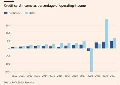 “Credit income accounted for about 47% and 66%, respectively, of Nordstrom’s and Kohl’s operating income, according to BofA. At Macy’s, the figure was about 55% in 2022, said Citigroup.”