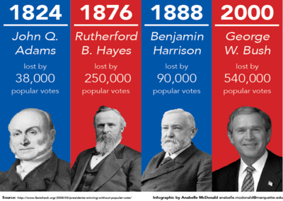 The system means that number of votes isn’t enough – candidates have to win votes in the right places (as bigger states count for more seats in the Electoral College). Al Gore famously won the popular vote in 2000 with 540,000 more votes than Bush, but it was Bush who entered the White House.