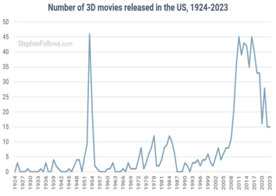 We think of 3D films as a modern phenomenon, but more of them were released in 1953 than in any year since. Alfred Hitchcock was among the many high profile directors who jumped on the bandwagon. Unfortunately, a combination of uncomfortable glasses and bad films caused a rapid decline in production soon after – that is, until Avatar restarted the hype all over again in 2009.